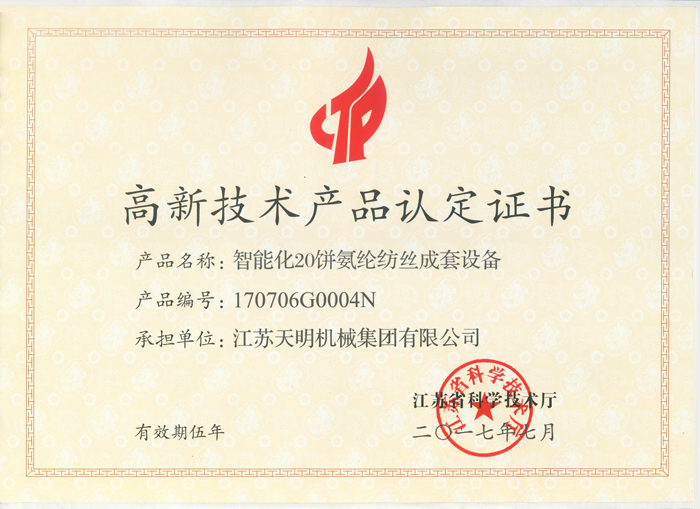 ● 2017年智能化立体集成氨纶纺丝成套设备荣获江苏省高新技术产品